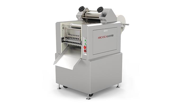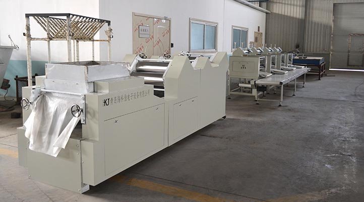 本設備有壓面機構、出面機構、壓針機構、鏈輪機構、機身機架等組成??膳c和面機、壓面機等組合成和面、壓面、沖壓成型、輸送烘干、包裝稱量等全自動系統。
