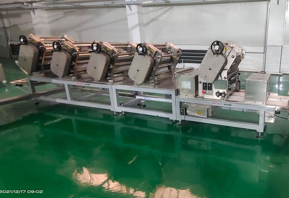 ◆ 面帶經過連續壓延輥壓成細密的、達到規定厚度要求的薄面片,形成更為完善的面筋網絡,面帶水分分布更加均勻,面帶具有一定的韌性和強度。